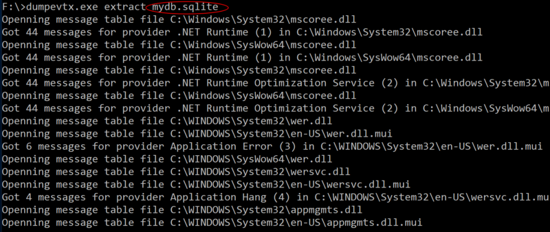 F:\\>dumpevtx.exe parse --messagedb mydb.sqlite c:\\Windows\\System32\\winevt\\Logs\\Security.evtx