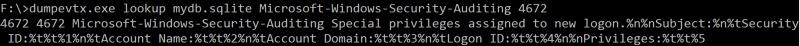 sqlite> **SELECT message FROM providers join messages on providers.id = messages.provider\_id where providers.name = 'Microsoft-Windows-Security-Auditing' and messages.event\_id = 4672;**