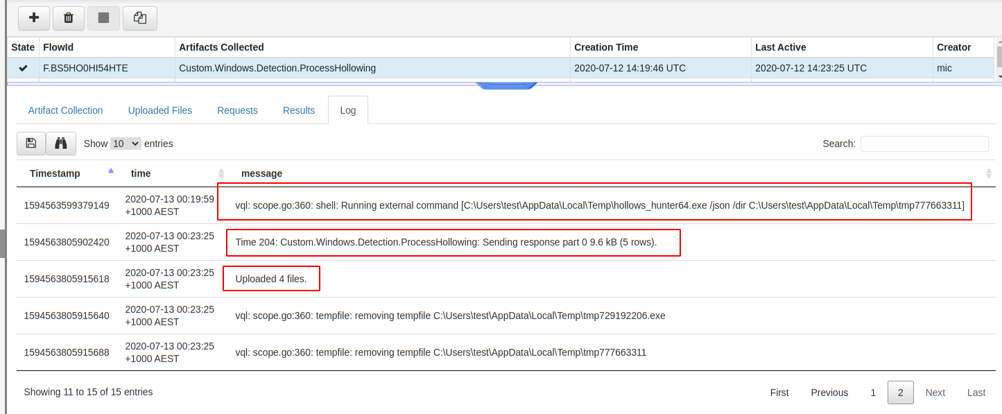 After the hollows hunter program ends, we glob over all the files in the temp directory and just upload them to the server (we chain the two queries together using the chain() plugin).