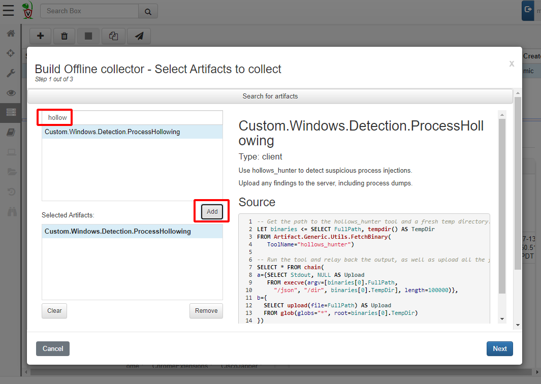 We can see that the hollows_hunter64.exe binary is copied into a temp file, executed and its results uploaded into the zip file. All temp files are cleaned up after collection.