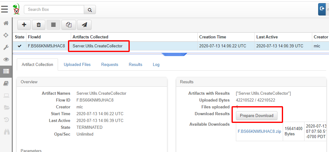 This process simply ends up calling the Server.Utils.CreateCollector artifact. The Artifact runs VQL query which creates the packed binary (on the server) and uploads it to the server again. We can simply click* “Prepare Download”* to obtain a zip file with the executable in it.