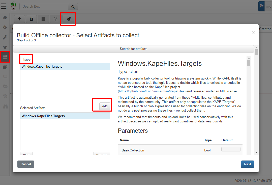 Velociraptor artifacts take parameters to control and customize the VQL they run. Depending on the chosen artifacts, different parameters will be available for configuration. Simply scroll down to select which Kape target file to collect As a reminder a KapeFile target (.tkape) file is a simple YAML file specifying a file glob pattern selecting certain files to collect.