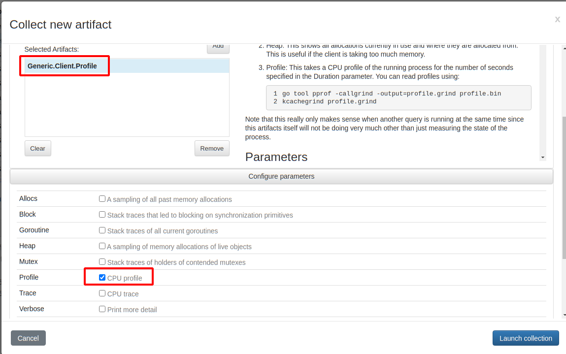 Simply schedule a new collection of the Generic.Client.Profile artifact, selecting the CPU profile checkbox (There are a number of other debugging data and traces that can be acquired at the same time but I won’t go into these here).