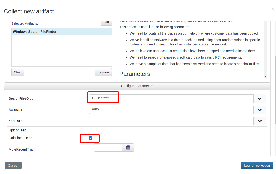 To illustrate this process I will launch a CPU heavy collection on my endpoint. I create a new artifact collection of the Windows.Search.FileFinder artifacts, searching recursively for all files below C:\Users and hashing them all.