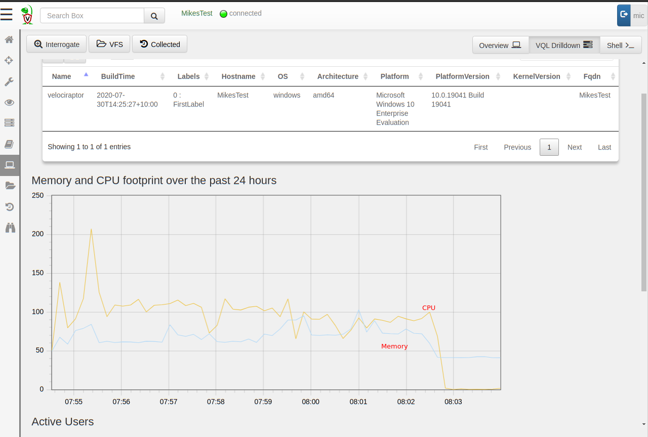 In the example above we see a typical hunt running on this specific endpoint — the CPU load spikes for a few seconds to a few minutes, then when the collection completes, the CPU load returns to normal levels (at less than 1% of one core), and a short time later memory use is also returned to the system. Of course depending on the specific hunt run, the amount of work the client has to do may be larger and take longer.