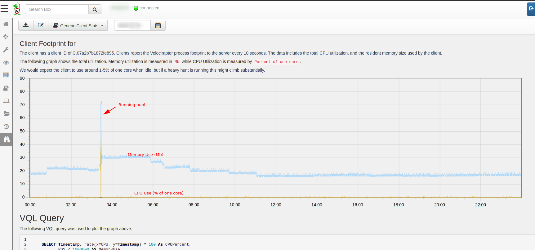 Those who have already seen Velociraptor in action might be very familiar with the built in telemetry available within the tool. The Velociraptor endpoint agents (termed Client) collect memory and CPU utilization information about the agent process every 10 seconds and send it to the server. The client performance stats are available right in the host overview page.