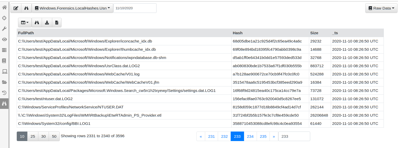 You can now easily page through the data viewing the hashes and files that were added since the query started. You can also download the entire SQLite database file from the endpoint, or watch the events on the server for specific file types or hashes found across the entire deployment.