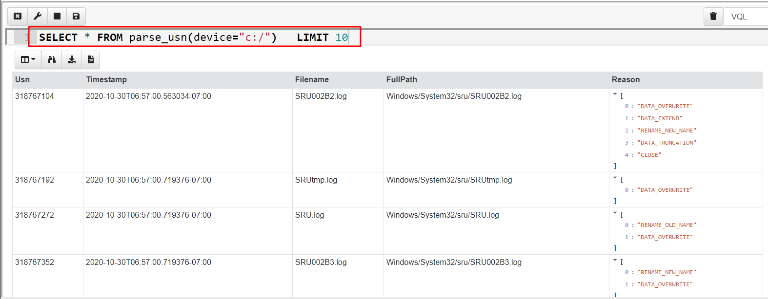 Velociraptor provides access to the USN parser via the parse_usn() plugin. Let’s see what kind of data this plugin provides by running a simple query in the notebook