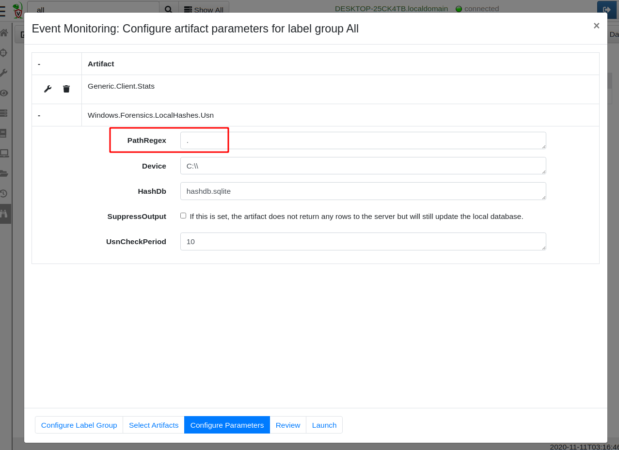 In order to get this query to run on the endpoints, we assign the artifact as a client event detection artifact, by clicking the “Client Events” screen and then the “Update Client monitoring table” button. After selecting the label group to apply to (All will apply this to all machines in your deployment), simply add the Windows.Forensics.LocalHashes.Usn artifact by searching for it.