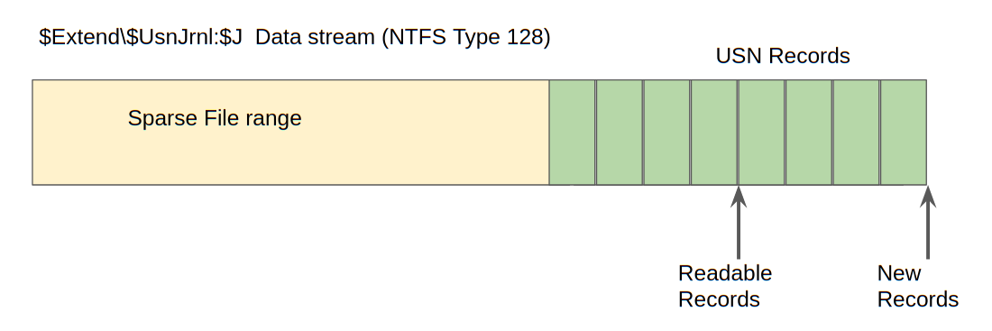 This means that in practice we find the $J file on a live system reporting a huge size (sometimes many hundreds of gigabytes!), however usually the start of the file is sparse and takes no disk space, so the $J file typically only consumes around 30–40mb of actual disk space. This is illustrated in the diagram below.