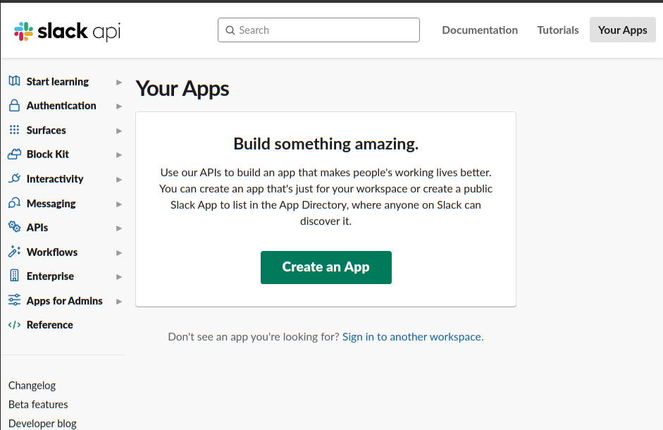 Next I will create an App which will communicate with the workspace and be able to post messages to the alerts channel. (This reference has a lot of details on this step, which I will just skip but you should consult it for your own use). First I visit the slack API page at https://api.slack.com/apps