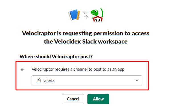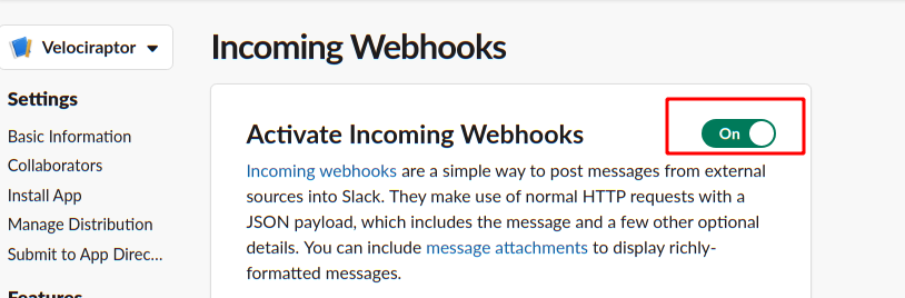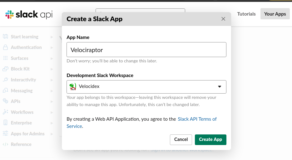 Next I will create an app called “Velociraptor” that will be able to push messages to my workspace.