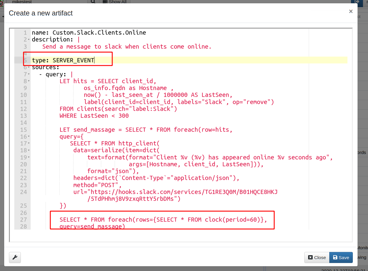 We previously saw how I can check for clients and send slack messages in the notebook. While this is fun and helps to develop VQL, in order to actually run this, we need to have the server monitoring for new clients all the time — in other words we need a Monitoring (Or Events) Artifact.