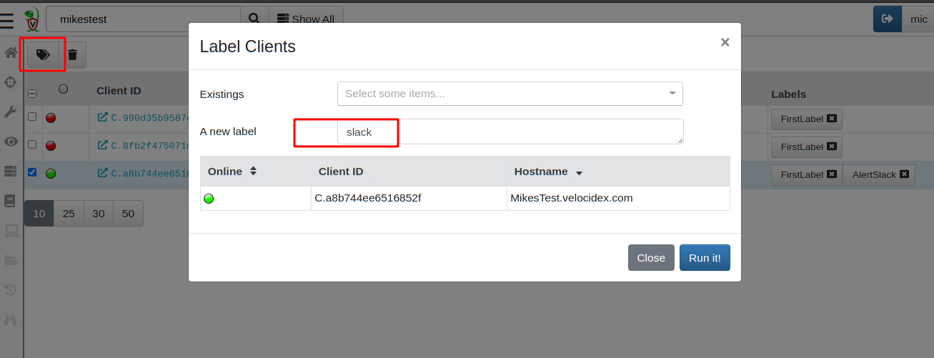 I will add the label “Slack” to my test machine by simply selecting it in the client search page and clicking the “Add Label” button.
