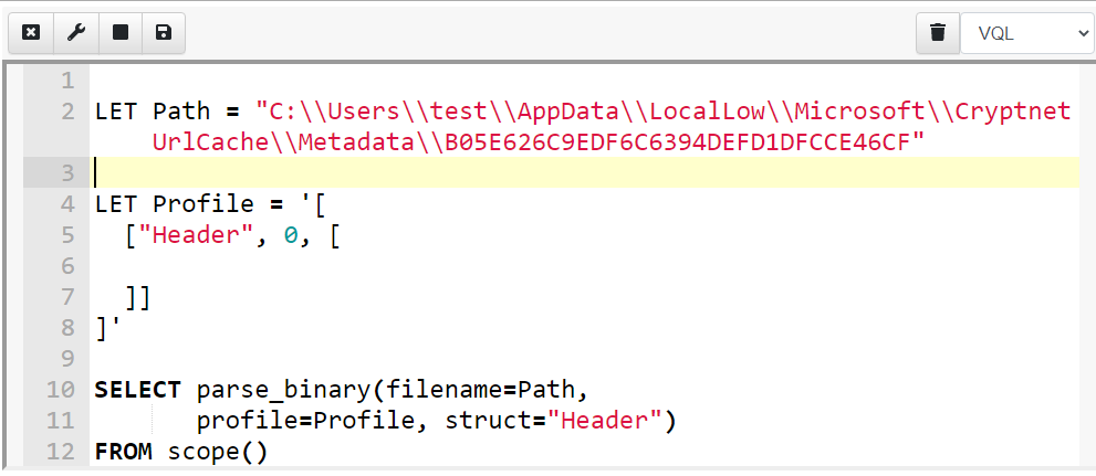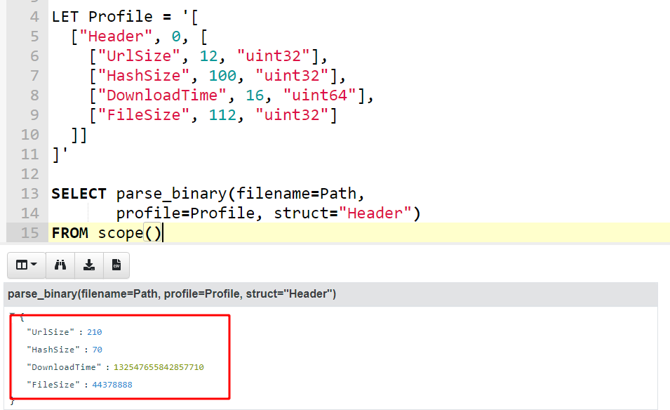 You can see the profile and the resulting object in the screenshot below. Velociraptor calls the parse_binary() VQL function which opens the file and parses the struct Header at offset 0.