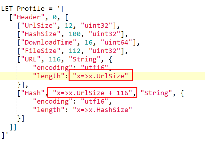 Because the offsets and sizes are not known in advance (URLs have different lengths), we need to define the profile dynamically. The profile will accept a VQL lambda function in many places. The lambda function receives the partially parsed struct and can use it to derive other values dynamically at runtime.