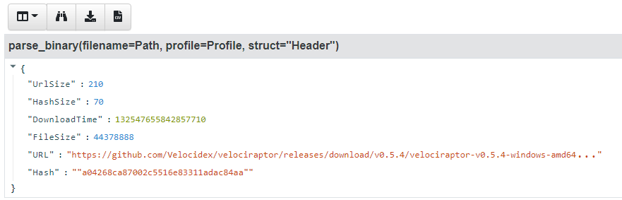 So far things are simple — we specified the offsets and types of each field and Velociraptor just parsed them. However, now we want to extract the URL. According to the Blog post the URL starts at offset 116 and has a length specified by the UrlSize field. It is then followed by the hash with a length specified by the HashSize field.