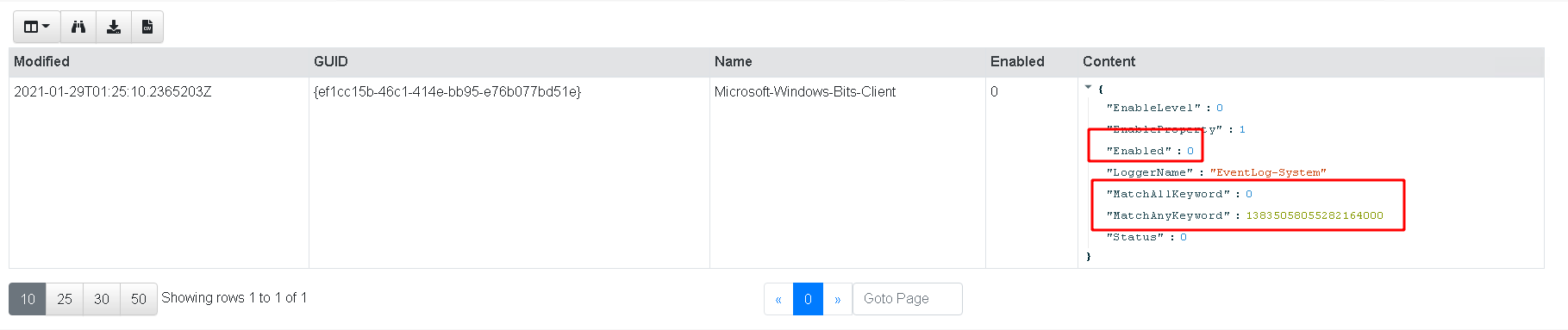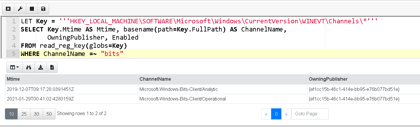 In this query we glob for all keys within the registry query above and extract the channel name (as the name of the subkey) and the Enabled valued. For the sake of simplicity I filtered the above to only examine the bits channels we are currently interested in.