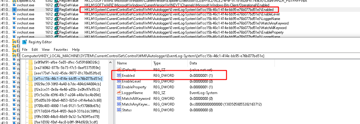 This second registry key disables the provider itself, while the previous method disables the channel (log file). The GUID in the registry key corresponds to the provider name. As described in our previous article the provider name can be derived from the registry key HKEY_LOCAL_MACHINE\SOFTWARE\Microsoft\Windows\CurrentVersion\WINEVT\Publishers\ which can be used to resolve the GUI to a name