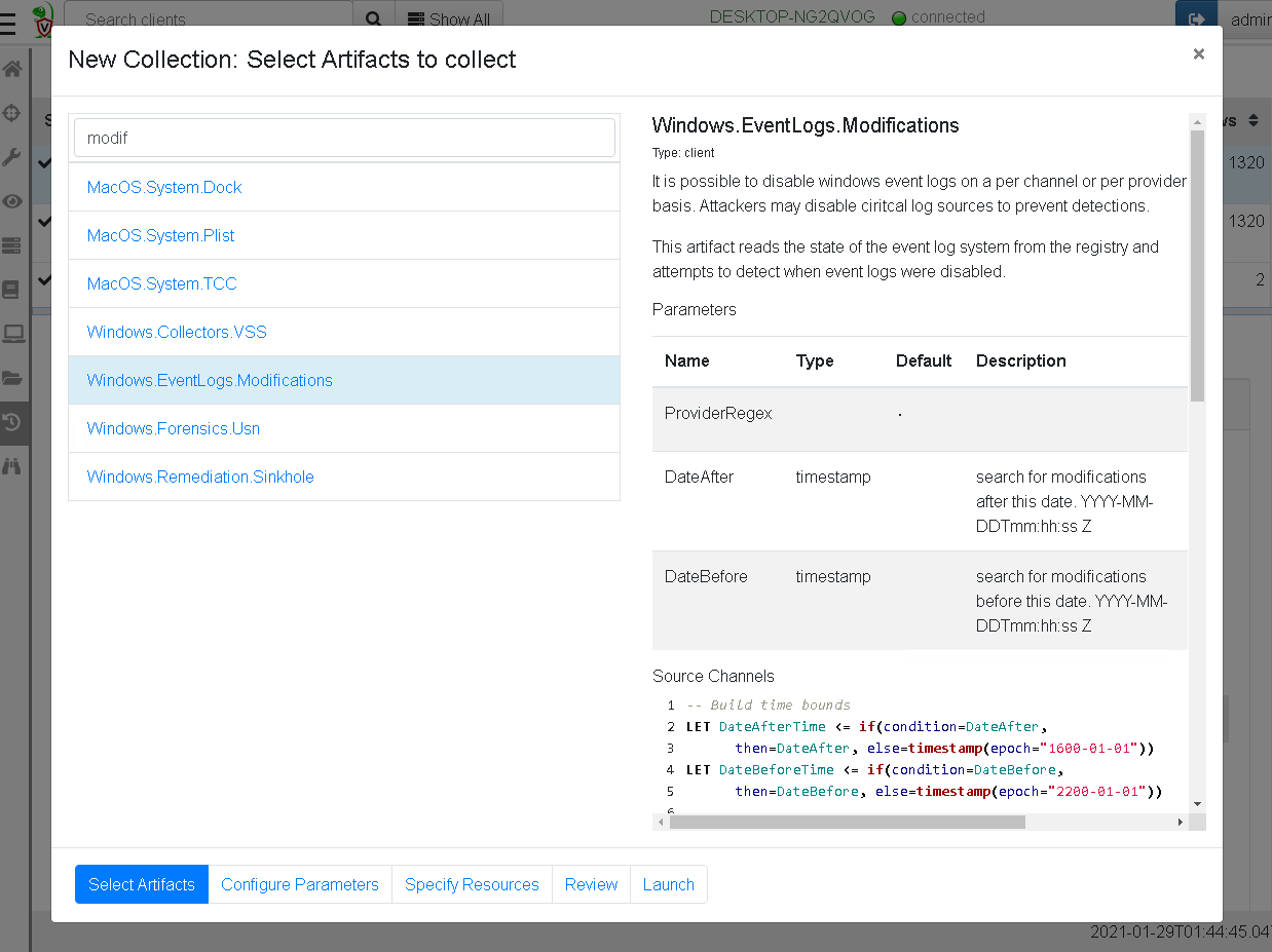 Armed with the above VQL queries, we can now write an artifact that collects this information from the endpoint. I also added some potential filters to make my artifact more targeted for hunting. You can see the full source of the Windows.EventLogs.Modifications artifact here