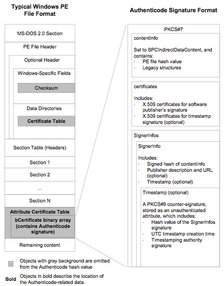 Authenticode uses a number of file format standards to actually embed the signature information into the binary file itself, as illustrated in the diagram below :