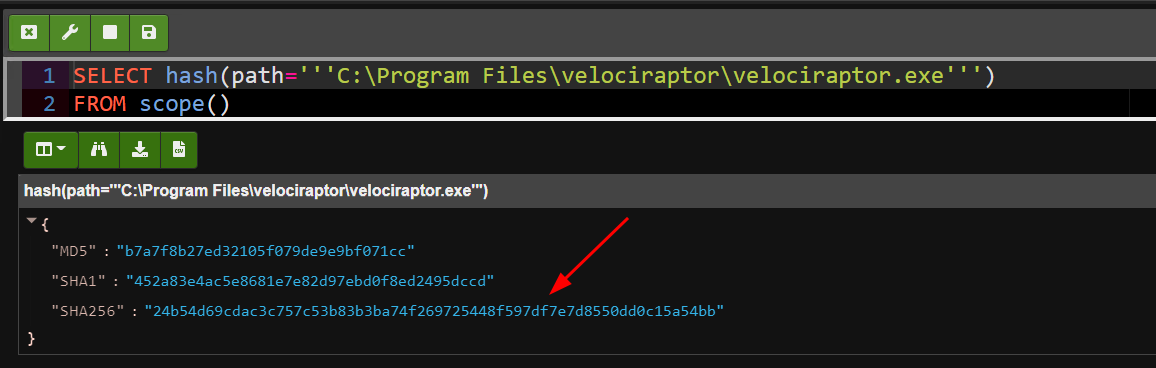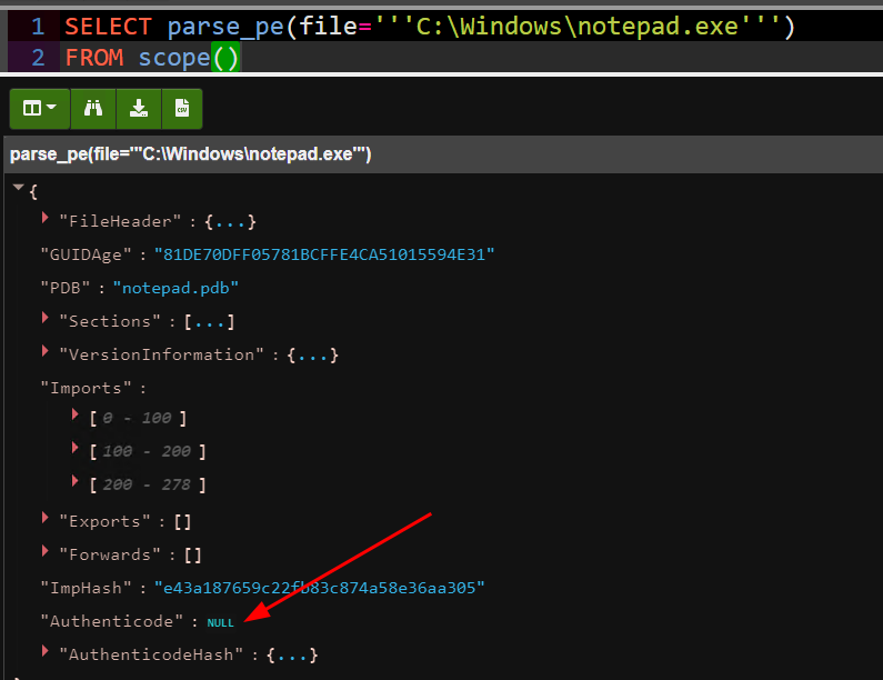 As we can see in the above screenshot, the authenticode standard provides an expected hash within the signature. However this is not the same as a file hash. We can verify this by simply calculating the hash using the VQL hash() function.