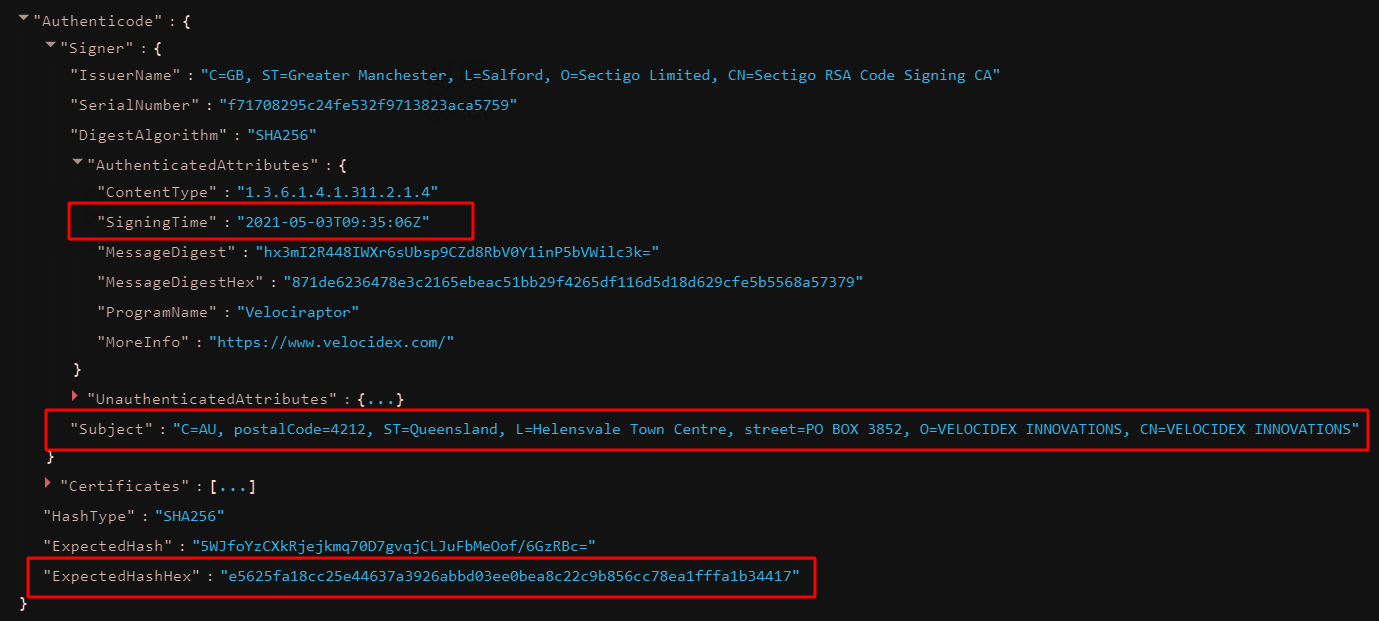 For example, let’s inspect the Velociraptor binary itself which is signed.