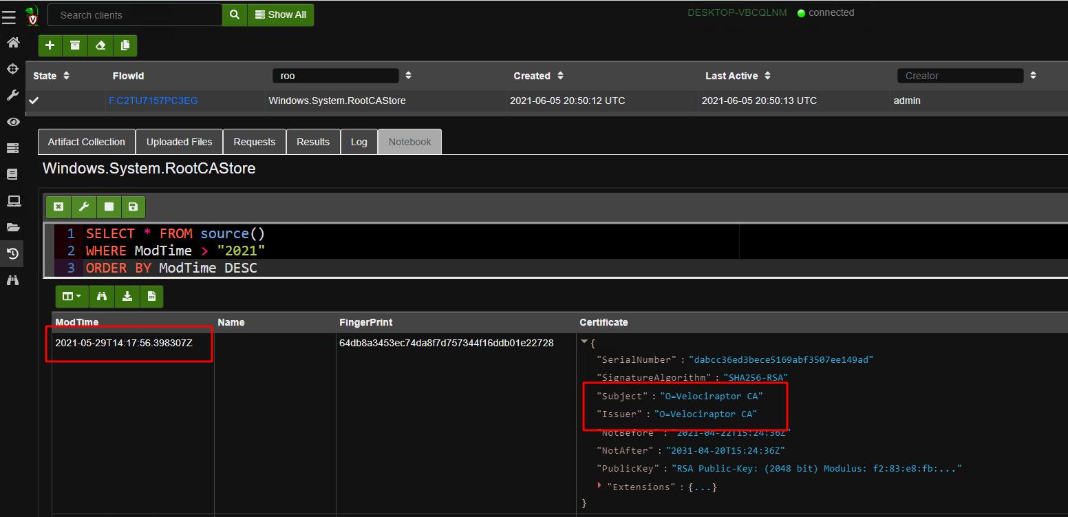 An added bonus of parsing the certificate directly from the registry keys is that now we have a registry key modification time to indicate when the certificate was installed into the root store. A quick VQL search to narrow down recently installed certificates can quickly zero in on malicious alterations and provide a timeline of compromise. Adding new certificates to a root store is not commonly done and even then they are likely to be done by a software update (so they should apply to most systems in the fleet). A hunt collecting this artifact and stacking by frequency can reveal compromises in minutes.