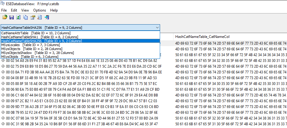 This process is obviously too slow for the OS itself to use. To speed things up, Windows uses a shortcut: A database file exists on the system which simply contains all the trusted hashes directly. The database uses the Microsoft ESE format and is located in C:\Windows\System32\catroot2*\catdb