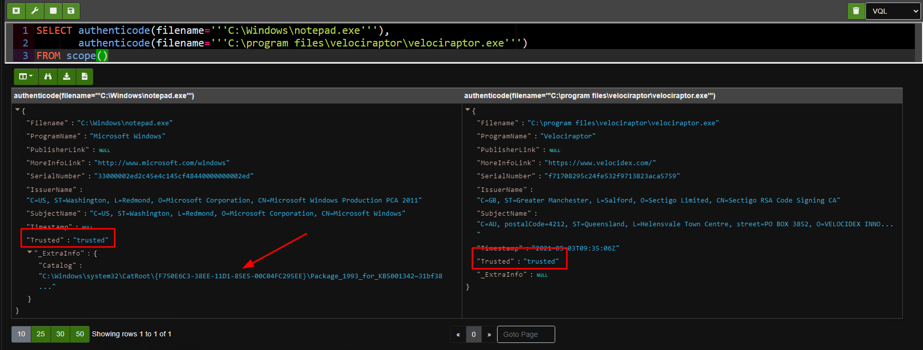 The above screenshot shows both our examples — The velociraptor binary was signed via embedded signature on the right and Notepad.exe was signed via catalog. In both cases Velociraptor is showing the signer and their issuers and if the file is trusted. We additionally get the catalog file that is used to verify the file if applicable.