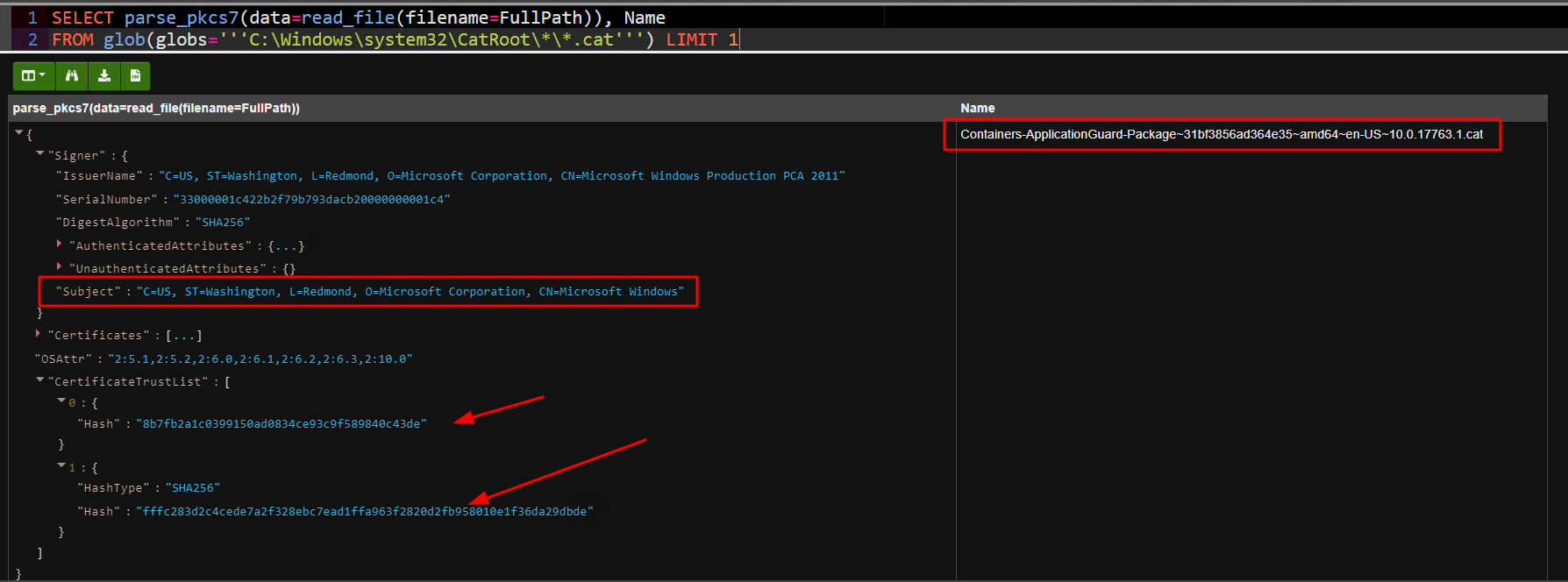 As can be seen in the above query, the cat file consists of a signer, and a list of hashes. Typically no filenames will be given for the hash (although sometimes there will be a filename hint). It is only the hashes that are important in cat files — this allows files to be renamed, but still verified.