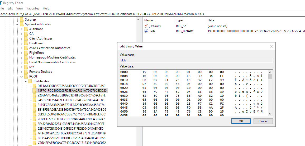 Where are the trusted certificates stored on the system? A quick registry search will show a set of keys and values for the trusted certificates within the windows registry