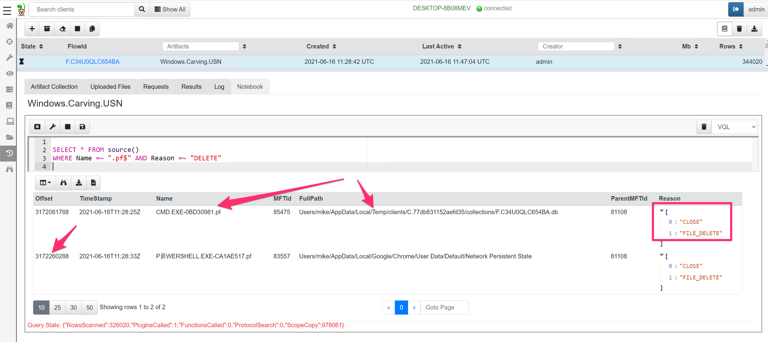 Note that in the case of deleted files, the filename stored in the USN record may be completely different than the FullPath shown by the artifact. The FullPath is derived by parsing the NTFS filesystem using the MFT entry id referenced by the USN record.