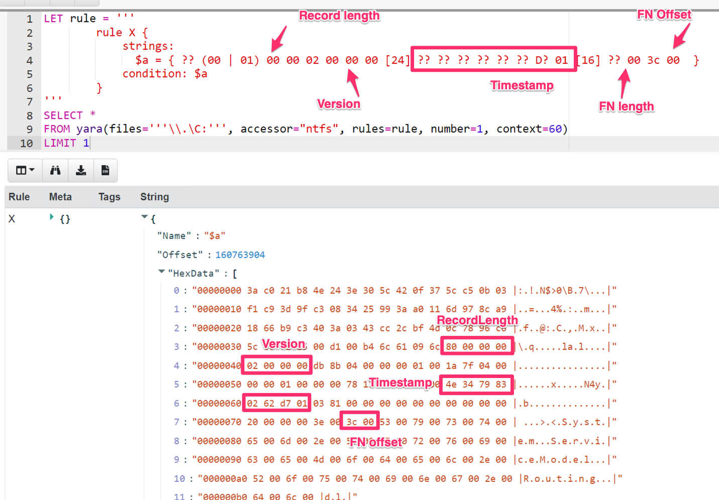 When I need a binary pattern matching engine, I immediately think of Yara — the Swiss army knife of binary searching! Let’s come up with a good Yara rule to identify USN journal entries. You can read more about Yara rule syntax here , but I will use a binary match rule to detect the byte pattern I am after.