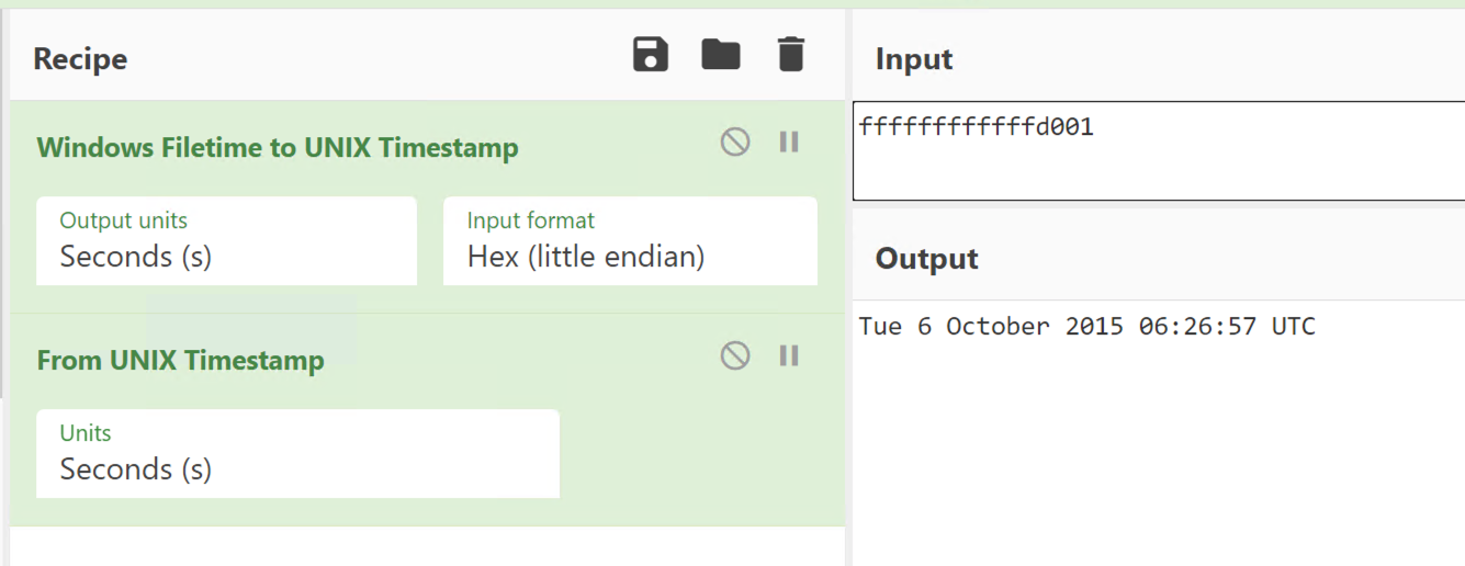 Let’s take a look at the timestamp above. I will use CyberChef to convert the hex to a readable timestamp.