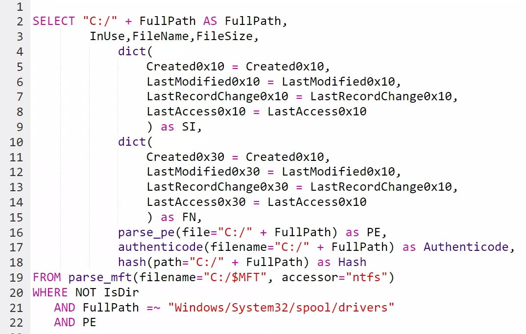 In this post we developed a VQL artifact to detect exploited systems by searching for residual printer drivers in the spools directory. We enriched our detection using Authenticode signature verification, file timestamps, file hashes and PE attributes (like the import/export table) to quickly determine which drivers were legitimate and which could indicate past exploitation.