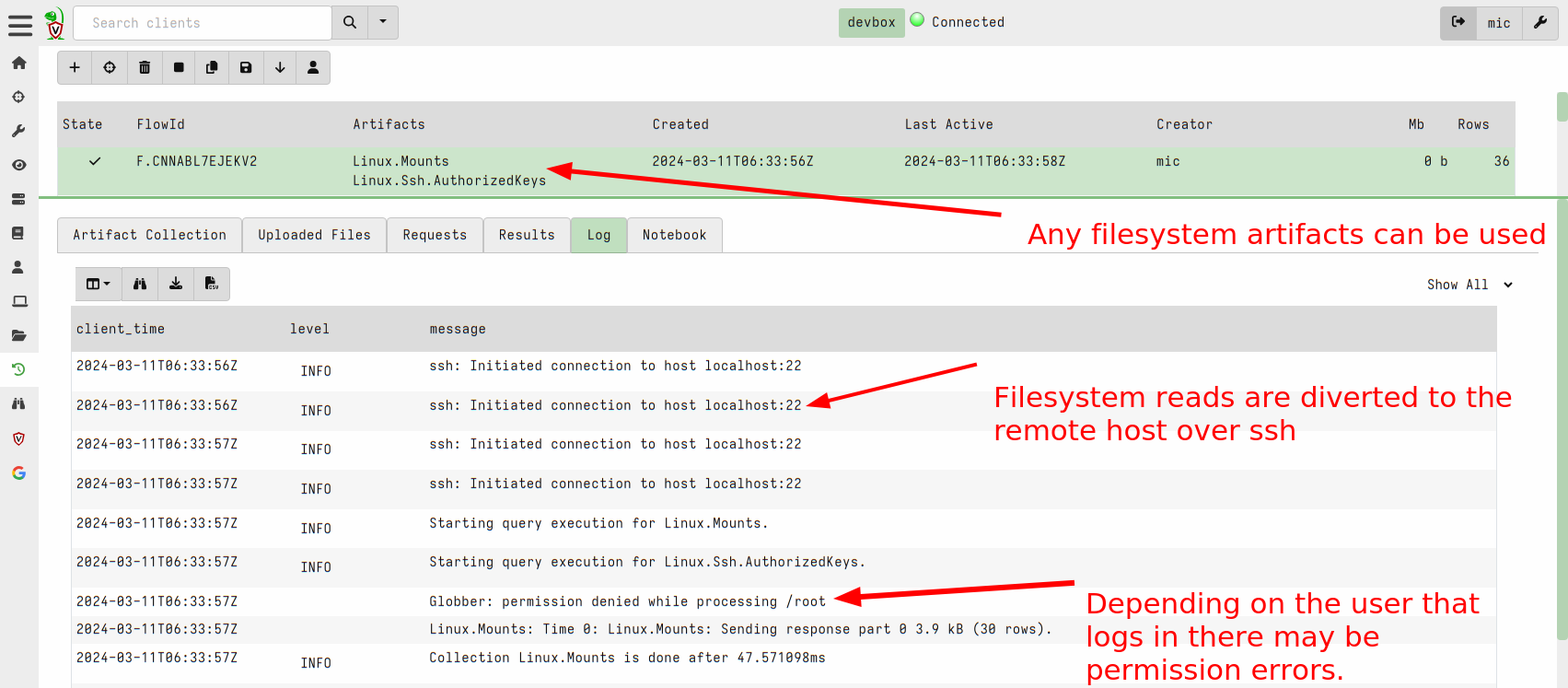 Next we launch a client with the remapping file. This causes any VQL queries that access the filesystem to come from the image instead of the host. Other than that the client looks like a regular client and will connect to the Velociraptor server just like any other client. To ensure that this client is unique you can override the writeback location (where the client id is stored) to a new file.