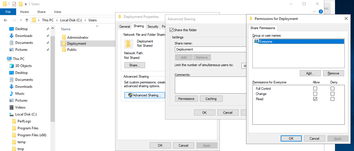 I created a directory C:\\Users\\Deployment and ensured that it is read only. I have shared the directory as the name Deployment.