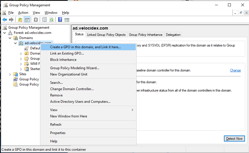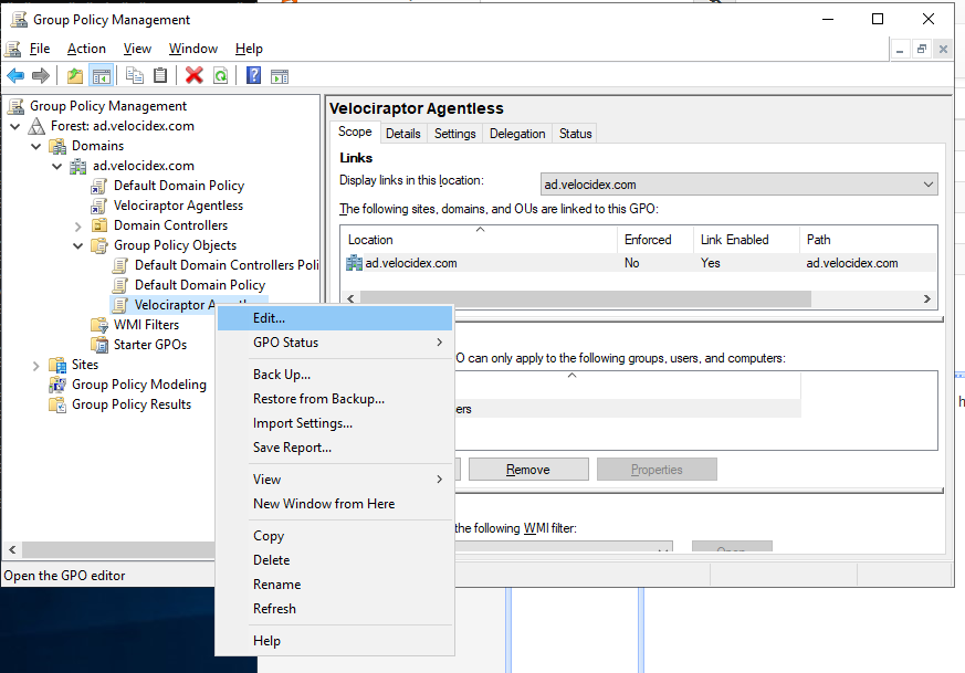 Next we create the group policy object which forces all domain connected machines to run the Velociraptor client. We use the Group Policy Management Console: