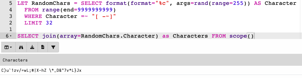 LET RandomChars = SELECT format(format="%c", args=rand(range=255)) AS Character